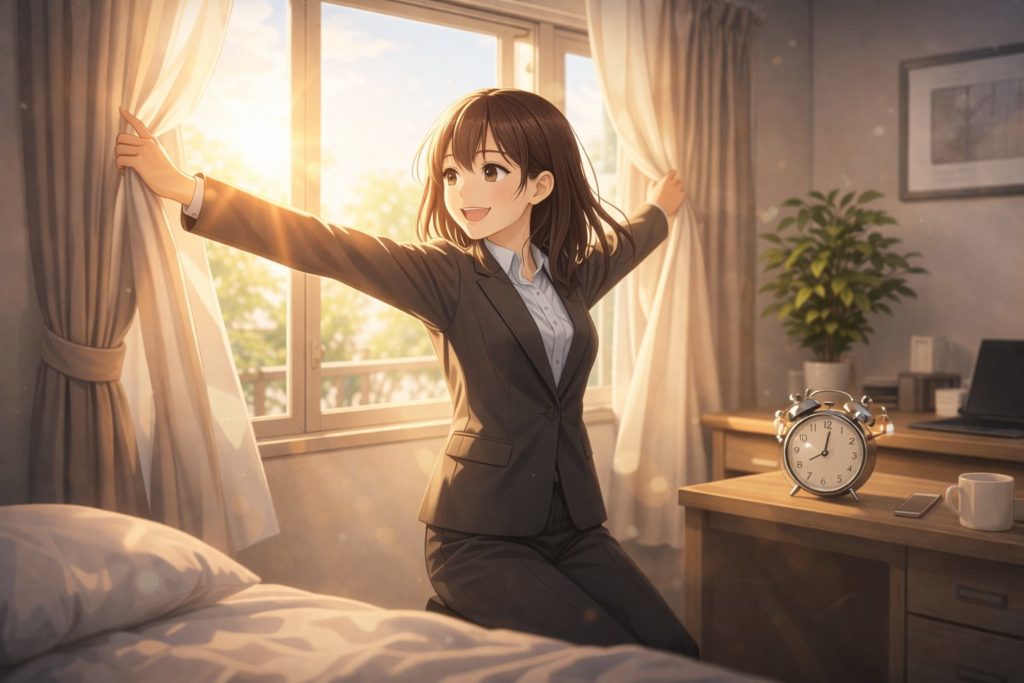アラームが鳴った瞬間にカーテンを開ける癖をつけると、二度寝のリスクを減らせます。